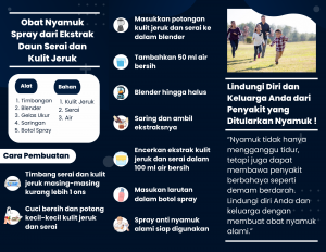 Kulit jeruk terdapat sitronelal, sitronelol dan geraniol yang diketahui berfungsi sebagai penolak nyamuk. Sedangkan ekstrak daun serai dapur mengandung zat sitronela yang dapat membunuh nyamuk dan semut. Sitronela memiliki sifat sebagai racun yang dapat memberikan kematian pada nyamuk, dimana nyamuk akan kehilangan cairan secara terus-menerus, sehingga nyamuk akan mengalami dehidrasi (kekurangan cairan). Kedua bahan baku tersebut menjadi pilihan yang tepat dalam pembuatan obat nyamuk spray alami, selain murah dan mudah didapatkan, bahan baku ini juga alami tanpa bahan kimia sehingga aman untuk Kesehatan serta ramah lingkungan.