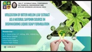 Semarang – Pada penyelenggaraan International Conference on Chemical Engineering and Applied Sciences (ICChEAS) 2024, Rofik Wahyu Hidayat, mahasiswa Program Studi Teknologi Rekayasa Kimia Industri (TRKI) Sekolah Vokasi Universitas Diponegoro (UNDIP), berhasil meraih penghargaan Best Presentation dalam kategori presentasi online. Rofik, bersama tim peneliti lainnya, mempresentasikan hasil penelitian yang berjudul “Utilization of Bitter Melon Leaf Extract as a Natural Saponin Source in Dishwashing Liquid Soap Formulation“, yang berhasil menarik perhatian juri dan peserta konferensi internasional ini. Tim peneliti yang terlibat dalam studi ini terdiri dari Dr. Ir. Fahmi Arifan, S.T., M.Eng., IPM., ASEAN Eng., Rofik Wahyu Hidayat, Deanira Arya Syifa, Enrico Fendy Sapatra, dan Callysta Najmi Raissa. Penelitian ini bertujuan untuk memanfaatkan ekstrak daun pare (Momordica charantia) sebagai sumber alami saponin dalam pembuatan sabun cuci piring yang lebih ramah lingkungan. Senyawa aktif dalam daun pare, seperti saponin, flavonoid, dan alkaloid, diketahui memiliki potensi sebagai bahan pembersih alami yang dapat mengurangi penggunaan bahan kimia sintetis.