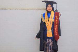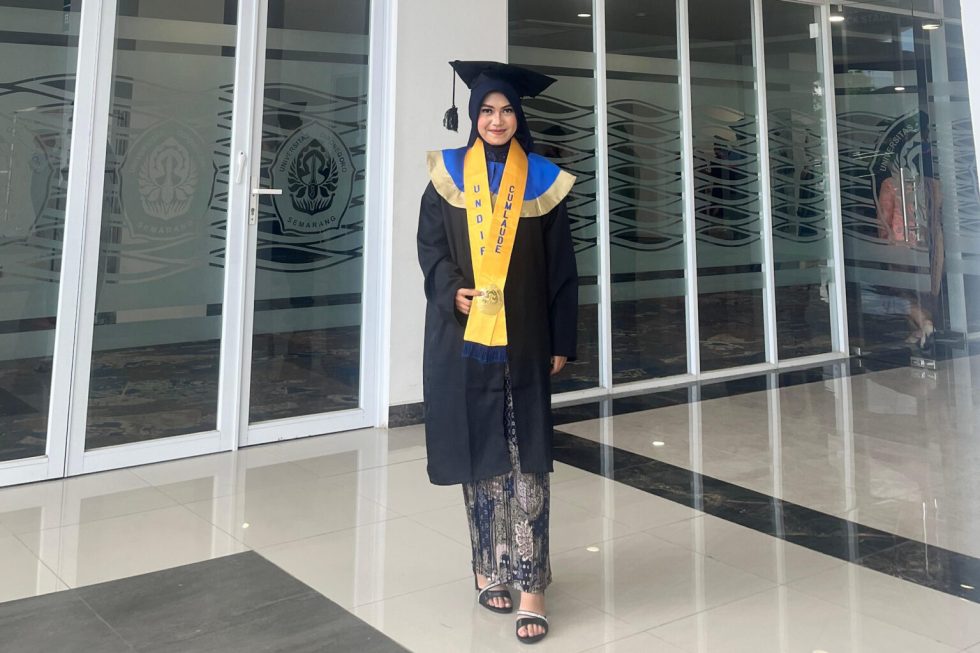 Semarang – Syaikha Butsaina Dhiya’ulhaq, wisudawan terbaik program Sarjana Terapan (D4) Teknologi Rekayasa Kimia Industri (TRKI) dari Sekolah Vokasi Universitas Diponegoro (UNDIP), menyelesaikan studinya dengan prestasi luar biasa. Ia lulus dengan predikat Cumlaude dan IPK 3,81 setelah menuntaskan pendidikan dalam waktu 3 tahun 11 bulan 1 hari. Syaikha merayakan momen kebahagiaan ini bersama keluarga tercinta di prosesi Wisuda ke-176 UNDIP yang digelar di Muladi Dome Gedung Serbaguna (GSG) UNDIP pada Senin (4/11). Syaikha mengungkapkan rasa terima kasihnya atas kesempatan yang diberikan oleh Sekolah Vokasi UNDIP. “Saya bersyukur bisa berkuliah di Sekolah Vokasi, karena fasilitas dan kesempatan yang didapat sangat mendukung perkembangan saya. Program D4 TRKI menawarkan pembelajaran yang kondusif, dengan dosen yang interaktif dan terbuka untuk diskusi. Selain itu, saya juga bisa mengikuti berbagai kompetisi yang dibimbing oleh dosen berkompeten,” ujarnya.