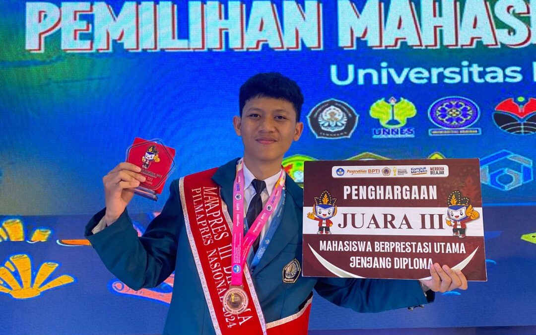 Rofik Wahyu Hidayat, a student from the Industrial Chemical Engineering Study Program at the Vocational School of Diponegoro University, successfully won third place in the Diploma Program category at the Outstanding Student Selection (Pilmapres 2024) event. The final round will be held in person at Gorontalo State University from July 24th to 28th, 2024. Pilmapres is a student competition organized by the Indonesian Talent Development Center, the National Achievement Center, the Ministry of Education, Culture, Research, and Technology of the Republic of Indonesia, and is held annually. The goal is to recognize the best students who are ready to be agents of change to build a better Indonesia. In this final, 31 students were selected from the 28 participating universities.